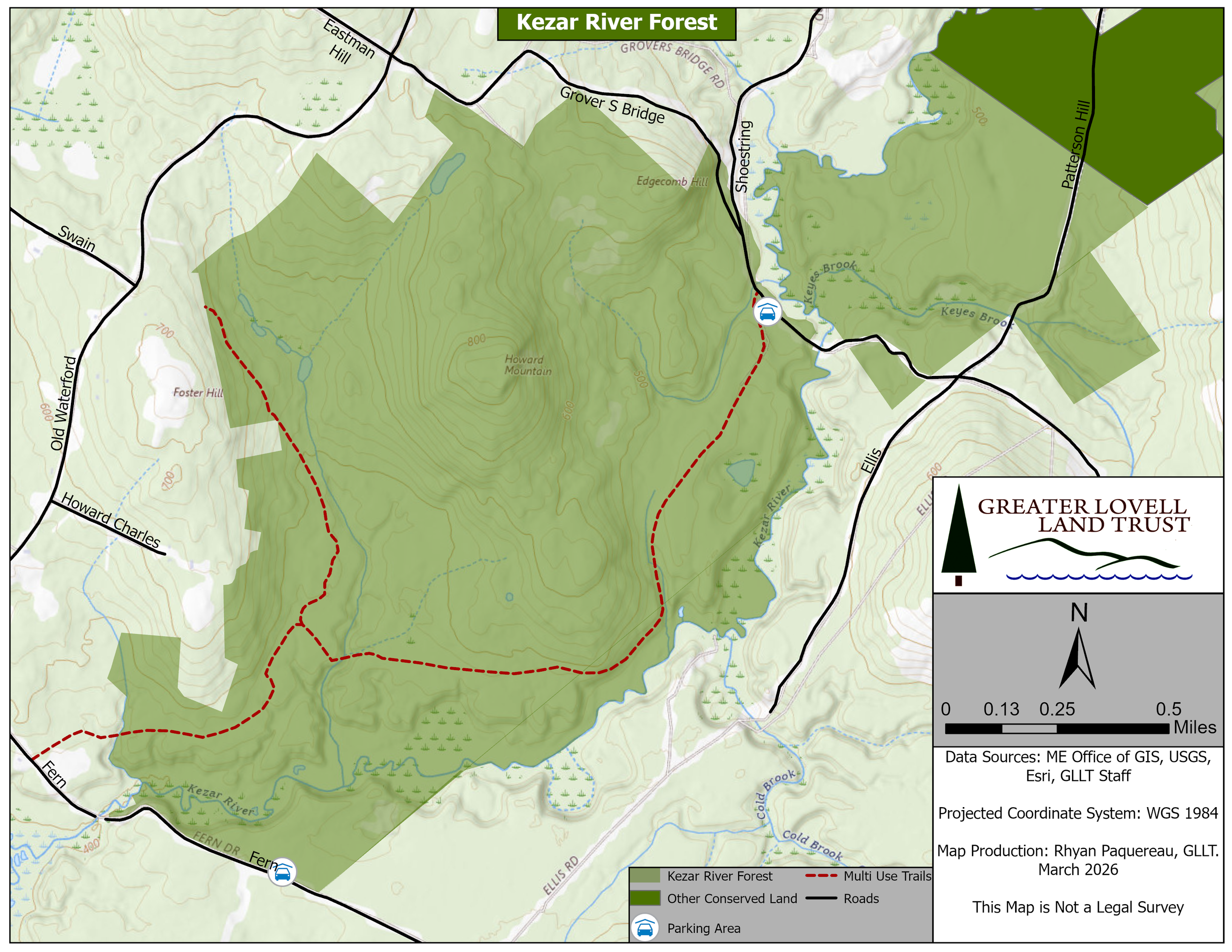Parking lots for the Kezar River Forest are located off of Fern Drive and Grovers Bridge Road. Keep in mind that these are dirt roads which can be easily damaged during mud season, and that these roads are generally not plowed in the winter. When parking along the roadside, please do not block the roadway, turn-outs for snow plows, or fire hydrants. Ellis Road, marked on the map above, is generally only passable by ATV/UTV.