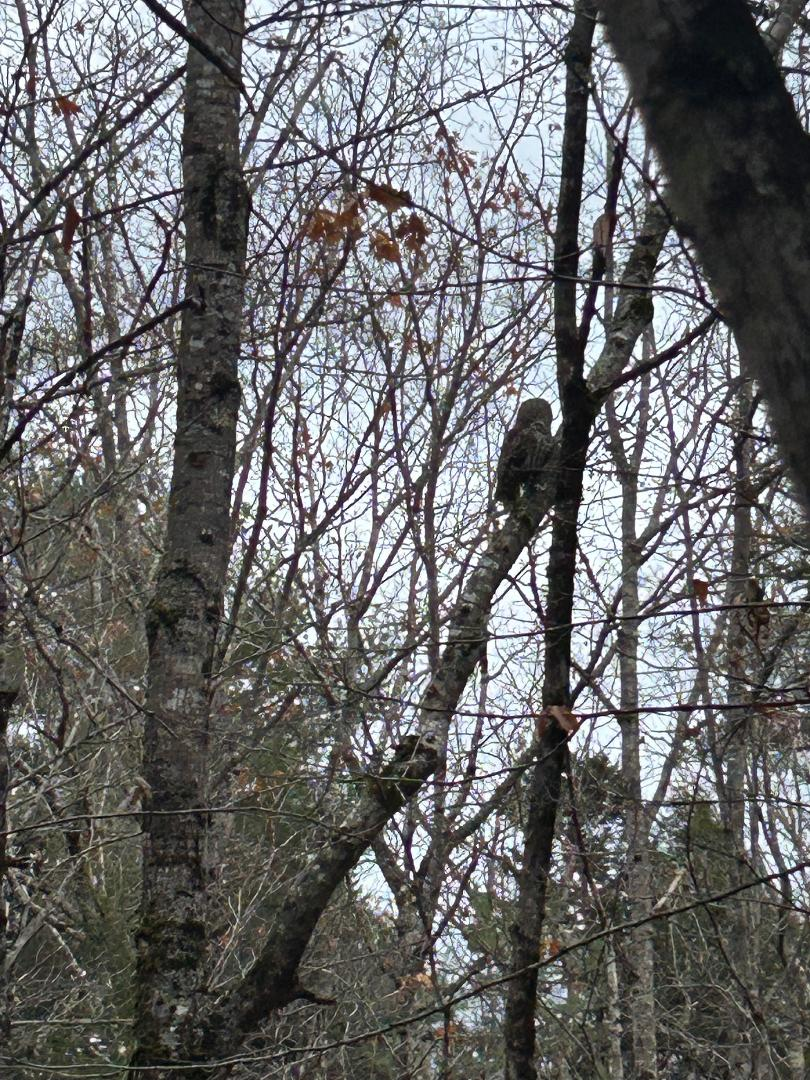 Suddenly movement and a whooshing noise came from behind me. A barred owl flew over me and landed in a tree about 10 feet up 15 yards away. It was looking to the north away from me. I watched for a minute trying to decide whether it was worth trying to take a photo with my phone. It seemed to be too dark for a photograph, so I figured that since it was so close I’d tease it a little.